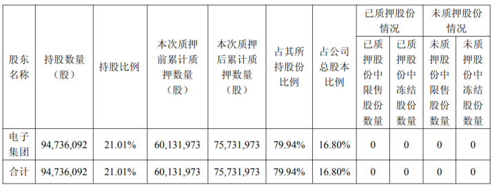 联创光电1月13日的公告显示,电子集团目前累计质押公司75,731,973股,占其所持股份比例79.94%,占公司总股本16.80%。