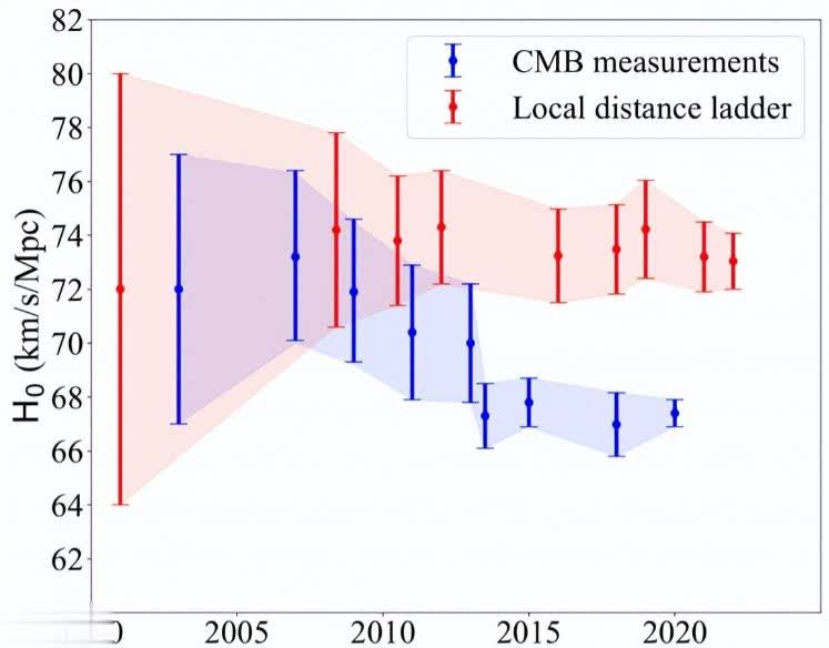 第二种方法就是利用宇宙微波背景辐射来测定,宇宙微波背景辐射是宇宙大爆炸留下的痕迹,利用它,也能够测定哈勃常数。在2009年的时候,科学家向太空发射了一个名为普朗克的卫星,这个卫星是用来探测宇宙微波背景辐射,宇宙微波背景辐射是来自宇宙大爆炸38万年后的第一缕光,我们称它为爆炸后的余晖,这是我们研究早期的重要信息,2013年的时候,普朗克的研究团队公布了第一批研究数据,根据这些数据,天文学家用另一种方式计算了哈勃常数的值(就是结合普朗克的观测和宇宙标准模型他们做了计算),计算出的哈勃常数的值为67.4KM/S/MPC,2015年又再次进行了确认,这个值没有问题。于是,令天文学家头疼的事情出现了,两种测算方式都没有问题,但结果为何不同呢,这让天文学家很困惑。