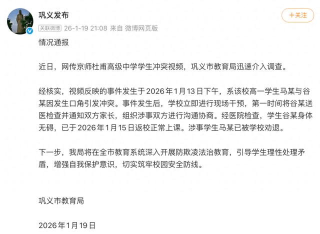 经核实,视频反映的事件发生于2026年1月13日下午,系该校高一学生马某与谷某因发生口角引发冲突。