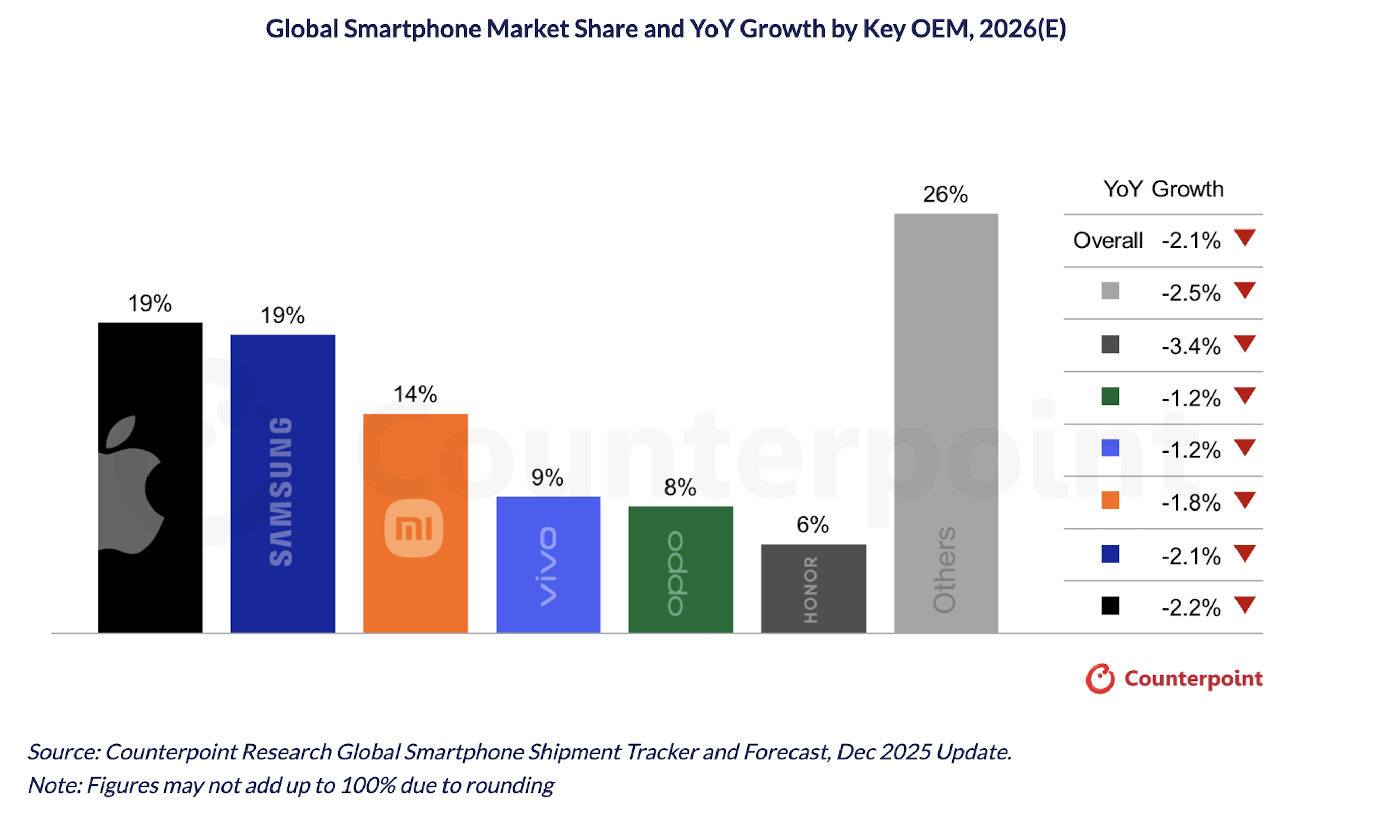 从厂商层面来看,所有品牌都将受到影响,但冲击程度并不相同。得益于更为稳健的财务状况与相对稳定的全球供应链,苹果和三星被认为具备更强的抗压能力,不过两家公司2026年的出货量仍被预测将下滑约2%。相比之下,中国厂商整体承压更重,利润空间被进一步挤压。报告称,荣耀的出货量降幅可能超过3%,而此前被认为有望在2026年实现增长的vivo和OPPO,如今也被修正为预计将出现下滑。