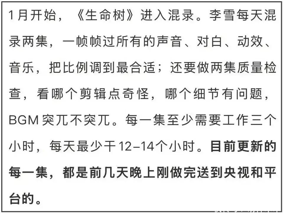另外,李雪还在采访中多次强调自己为了赶档期有多辛苦。他提到这段时间自己每天都是凌晨4、5点回家,最多连续一周没见过孩子。哪怕回家躺下了,脑子都在高速运转,只为了能够放心地把画面交到观众眼睛、耳朵里去。字里行间都在表达着自己为了观众付出的辛苦、做出的奉献。