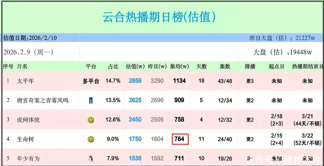 比起收视率,更惨的是网播成绩。从某博主分析的云合热播期日榜估值表中可以看到,《生命树》网播占比不到10%,位列第四名。重点是,已经播出过半但集均播放量竟然还不到800万,网播扑街得格外彻底。